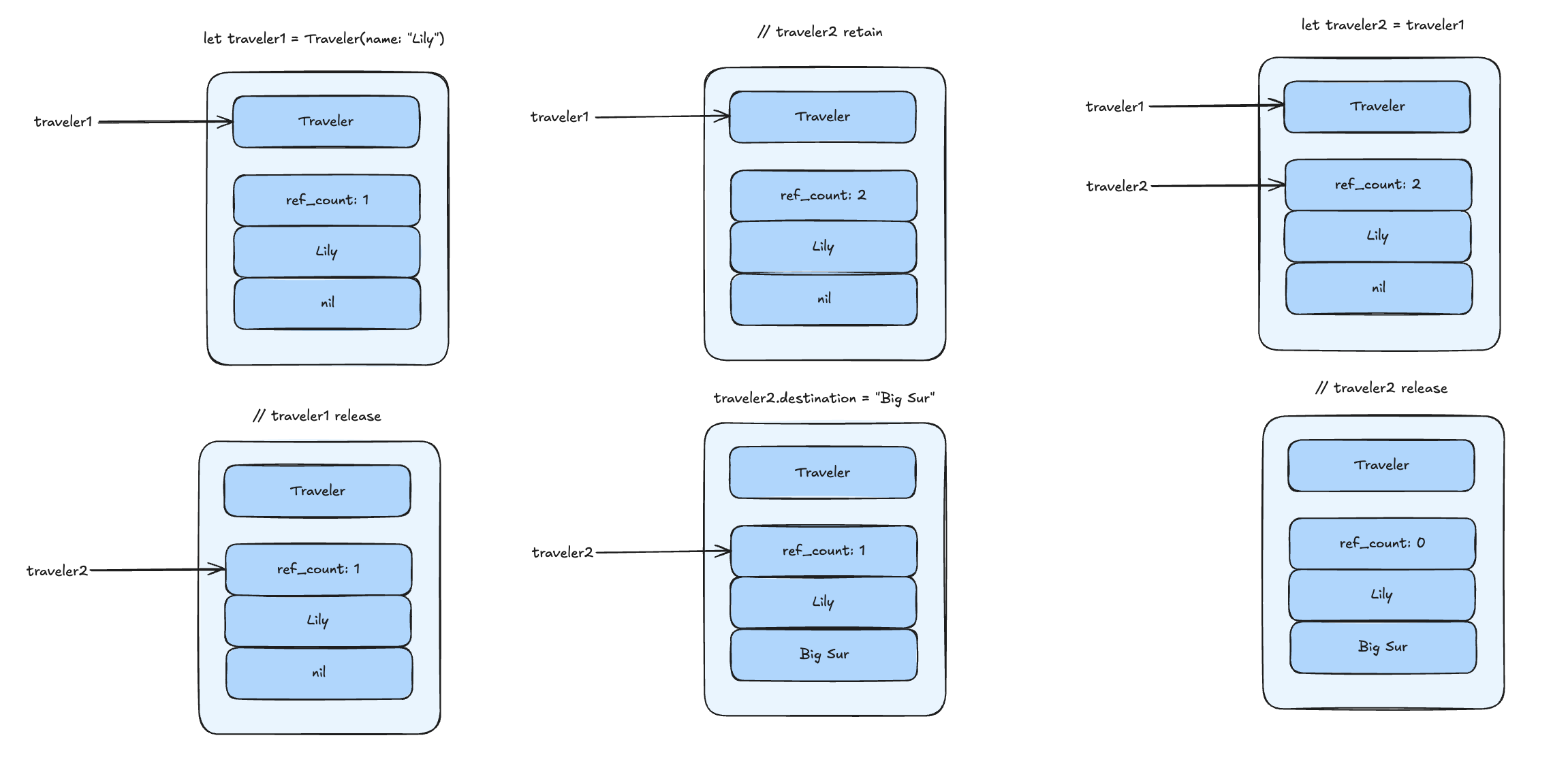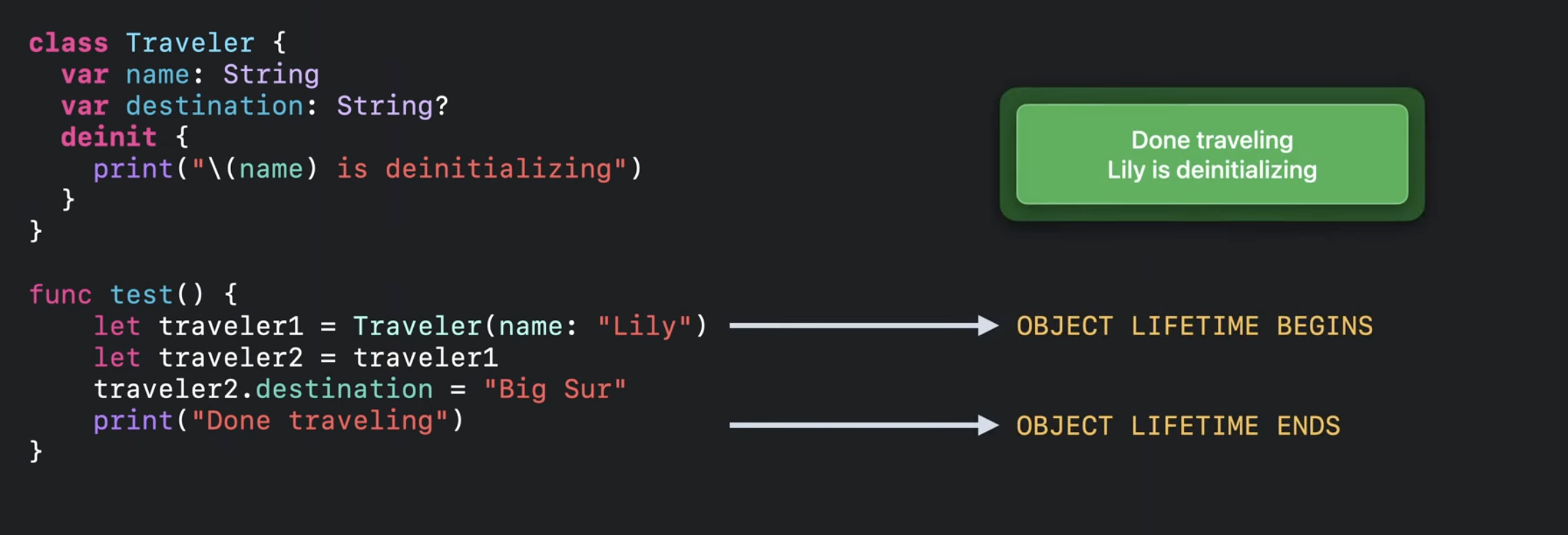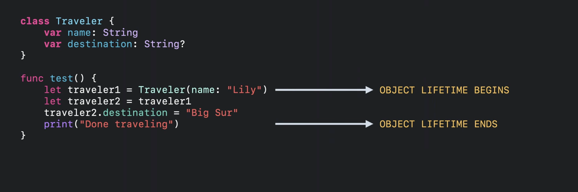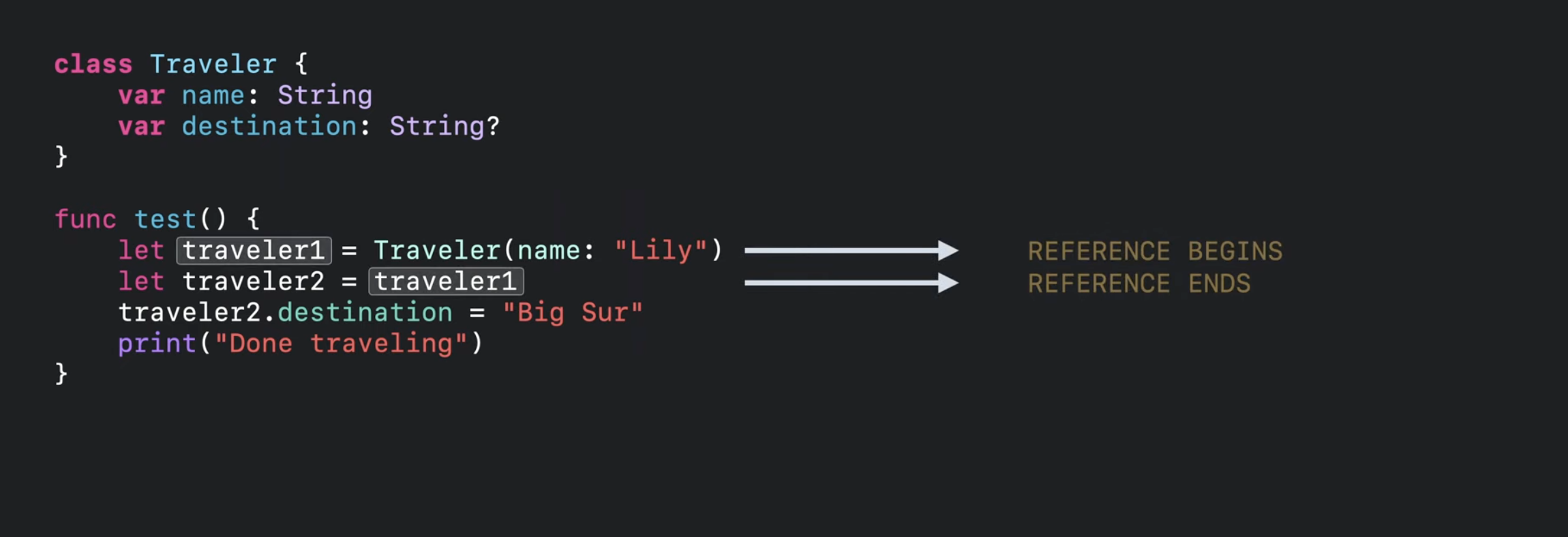 Swift 컴파일러는 traveler1 참조의 마지막 사용 직후에 relase 작업을 삽입함.