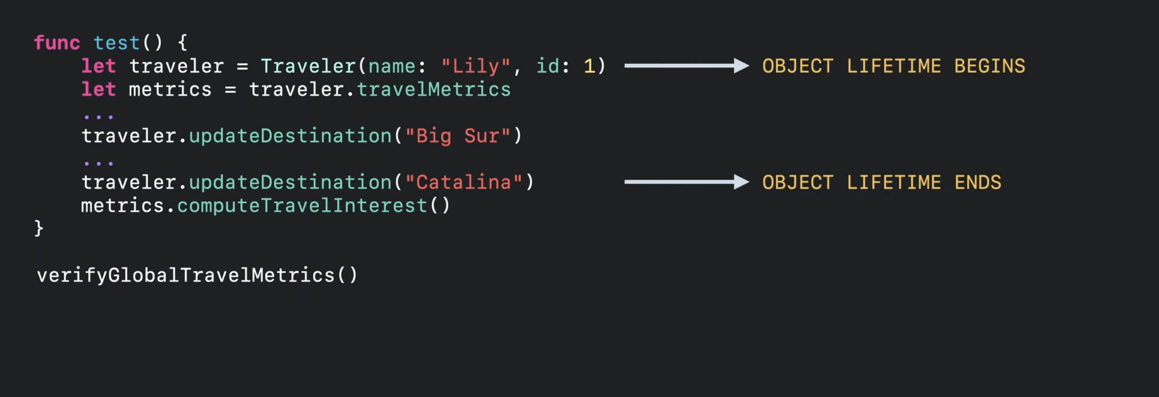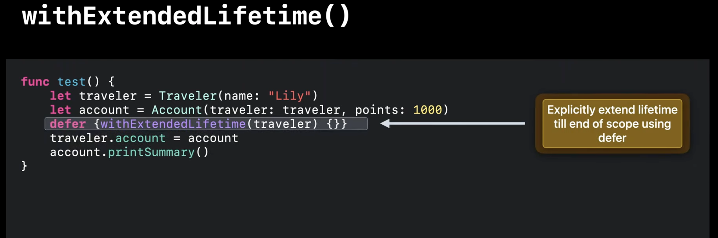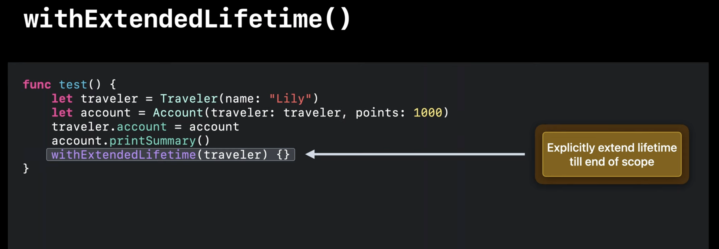 withExtendedLifetime을 사용하면 객체의 수명을 연장하여 printSummary() 함수가 호출되는 동안 Traveler 객체의 수명을 안전하게 연장하여 잠재적인 버그를 방지할 수 있음.