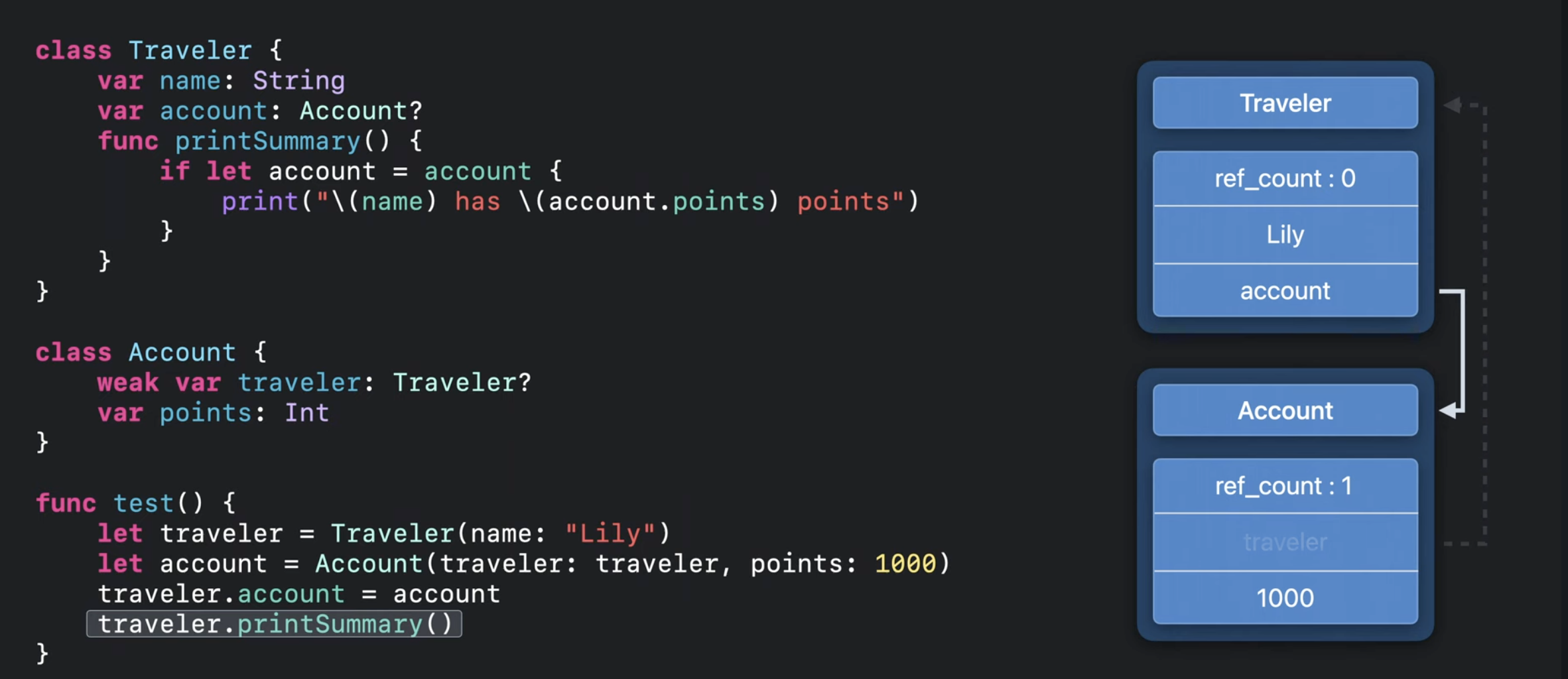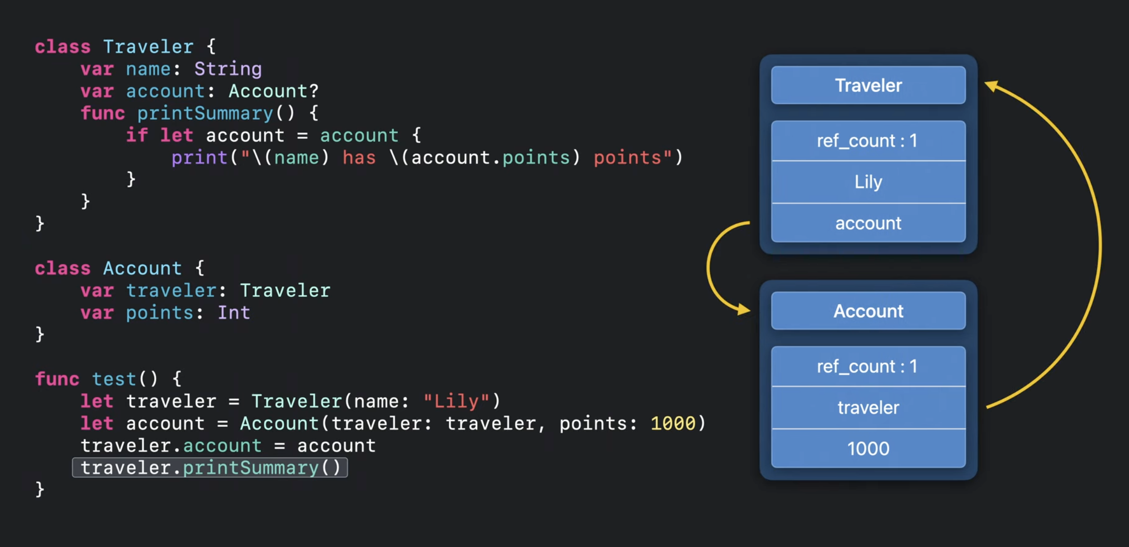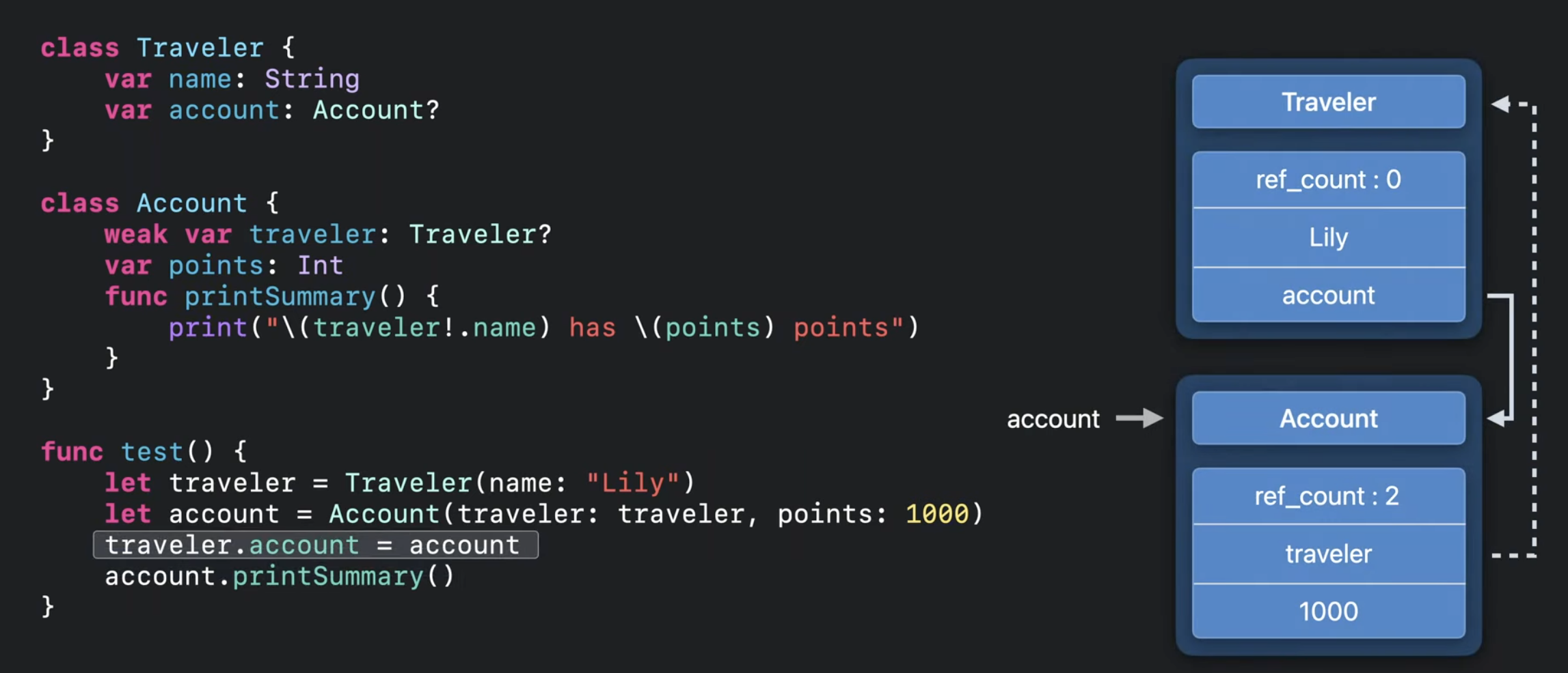 만약 컴파일러가 마지막 사용 이후 release를 삽입한다면 Traveler의 ref_count는 0으로 떨어지고, Account에 위치한 Traveler는 결국 nil이 되어서 문제가 발생할 수 있음.