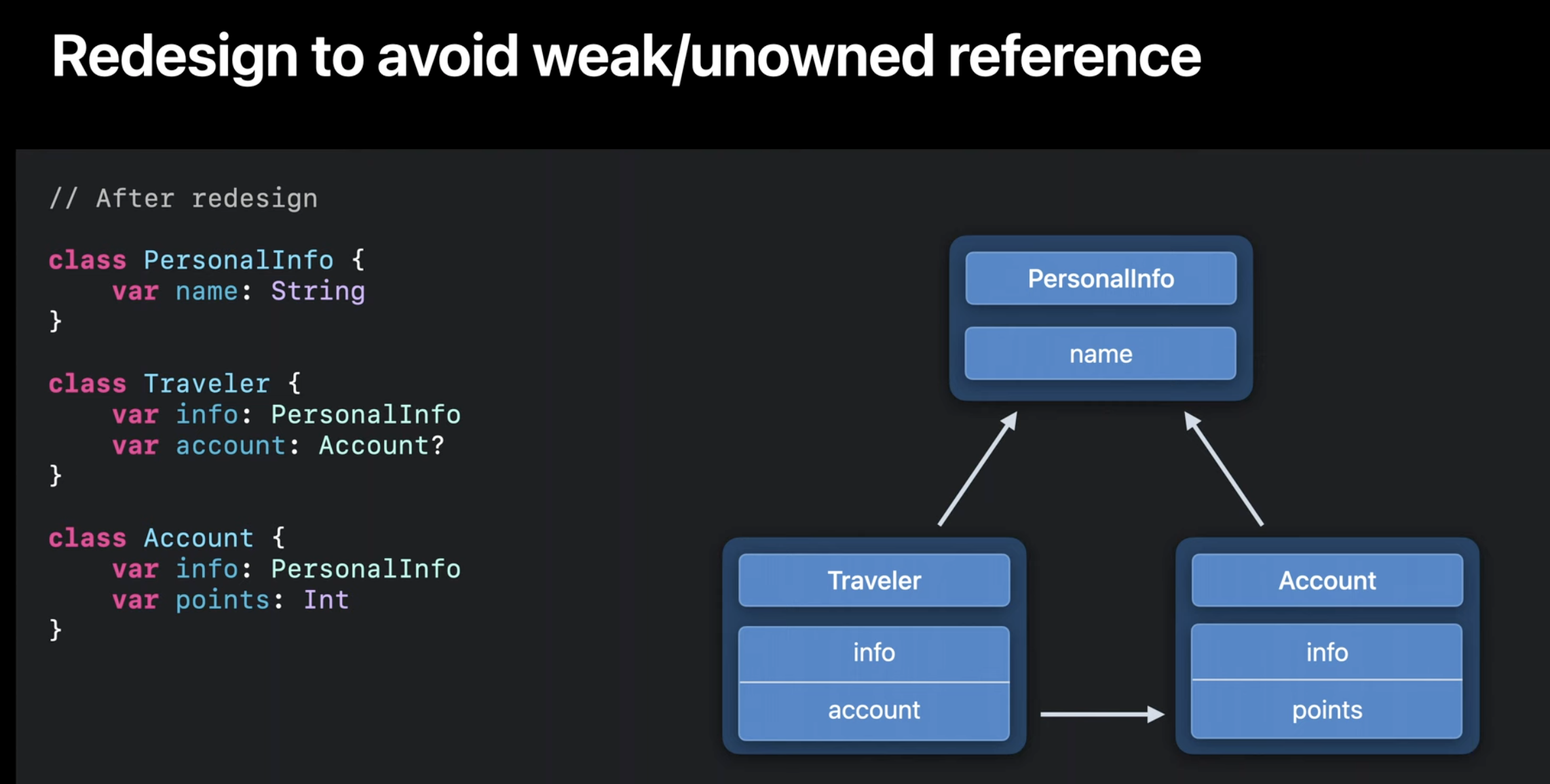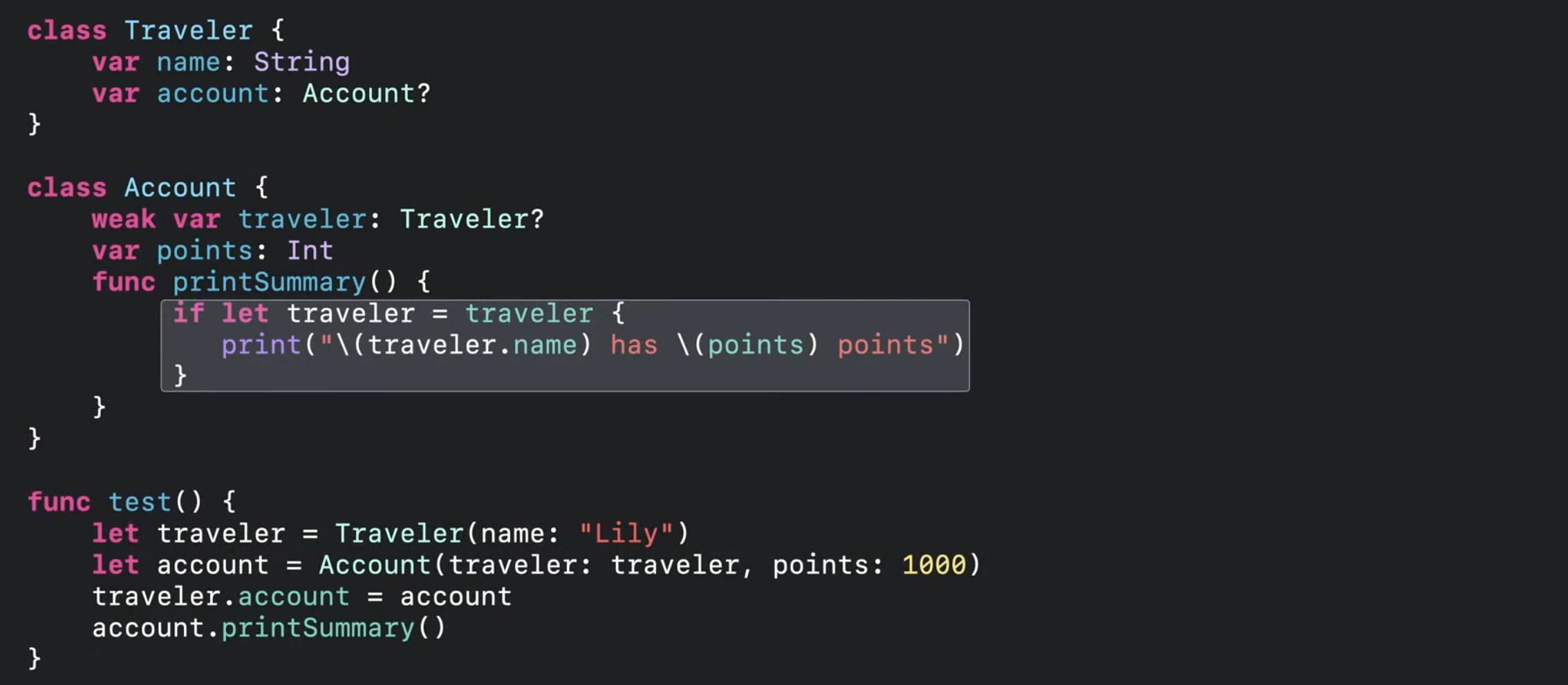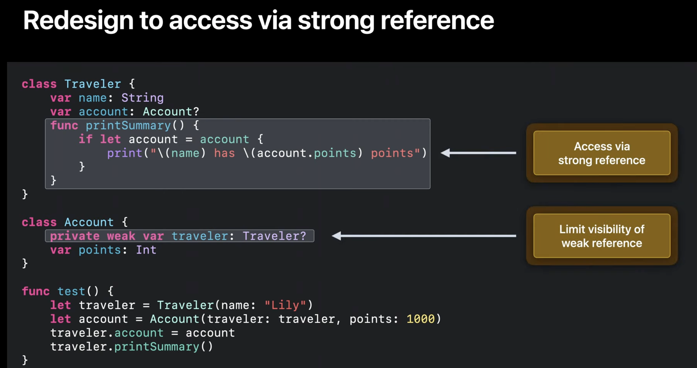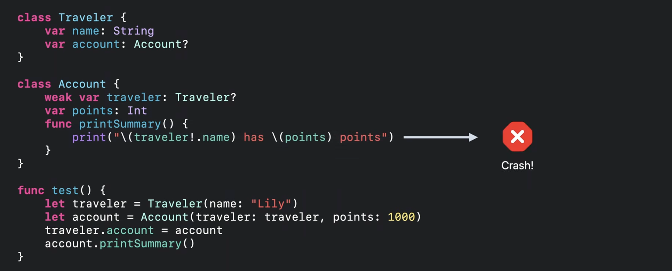 만약 컴파일러가 마지막 사용 이후 release를 삽입한다면 Traveler의 ref_count는 0으로 떨어지고, Account에 위치한 Traveler는 결국 nil이 되어서 문제가 발생할 수 있음.