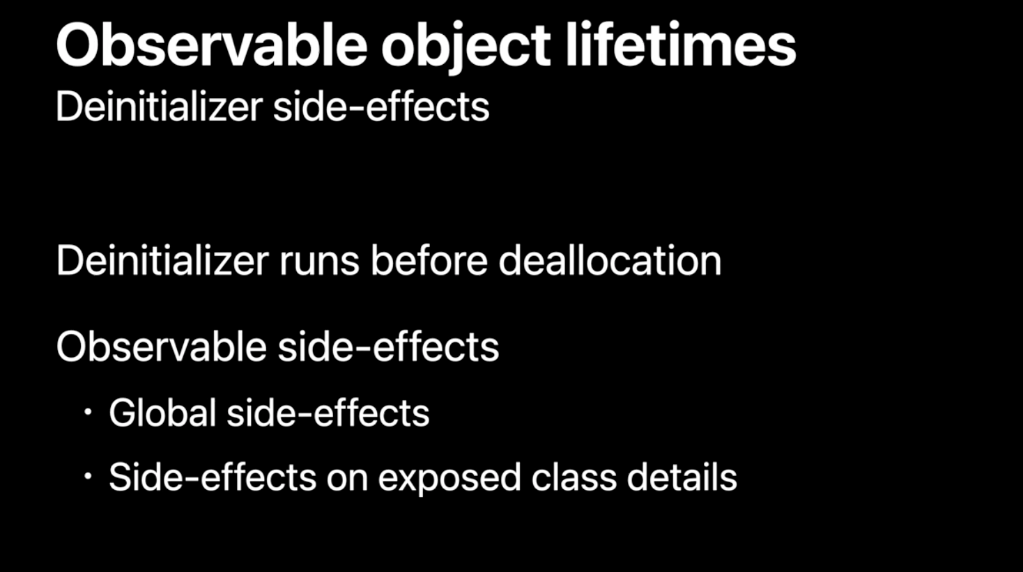 deinit은 할당 해제 전에 실행되며, 여기서 발생하는 side effect는 외부에서 관찰될 수 있음.
