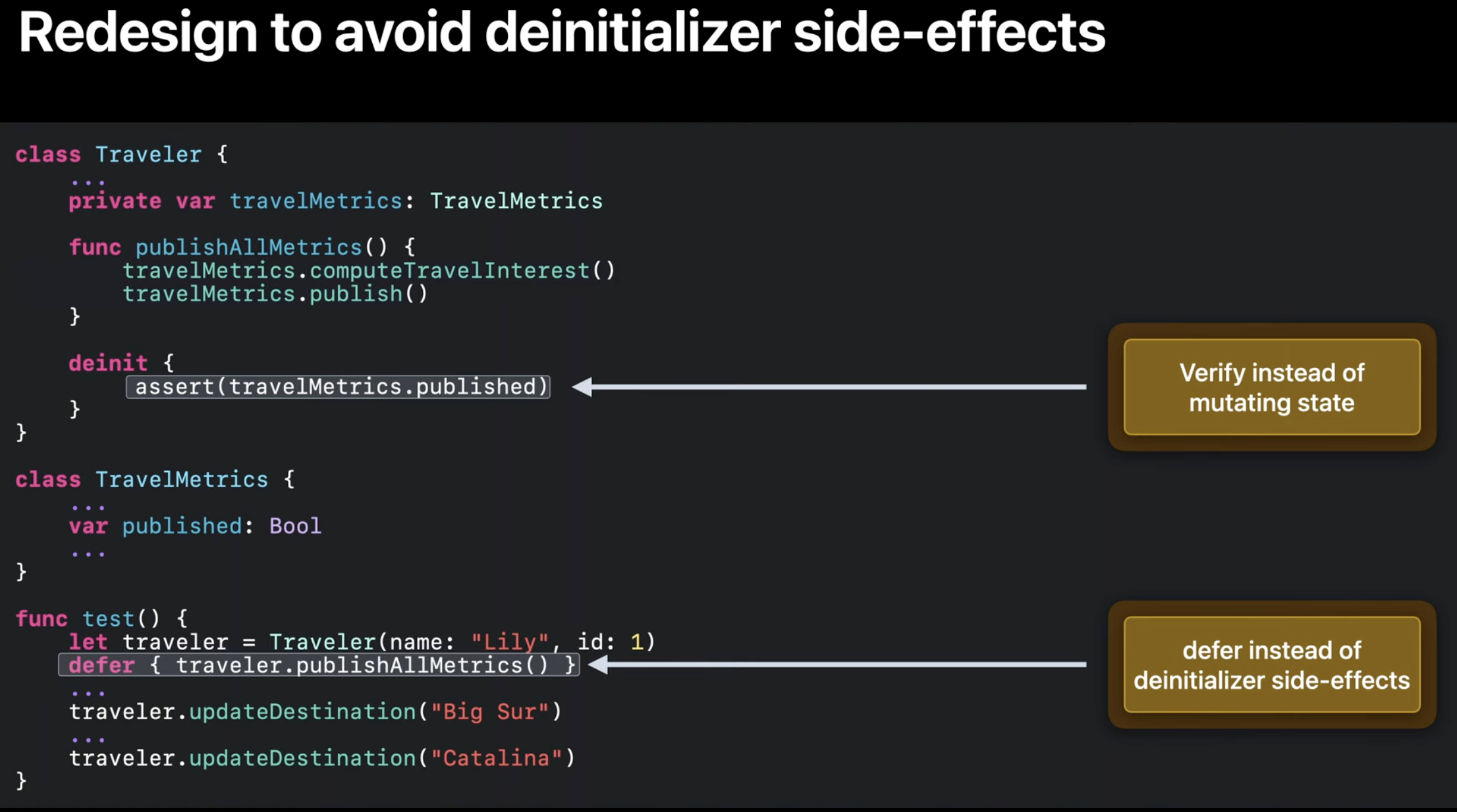 객체 수명과 관련한 문제에서 deinit 문제를 근본적으로 해결하기 위해서 deinit side effect를 없애는 것임.