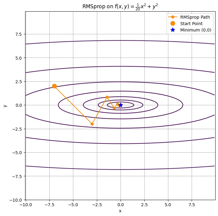 # RMSprop 설정: lr=0.1, decay_rate=0.99 (일반적인 설정)