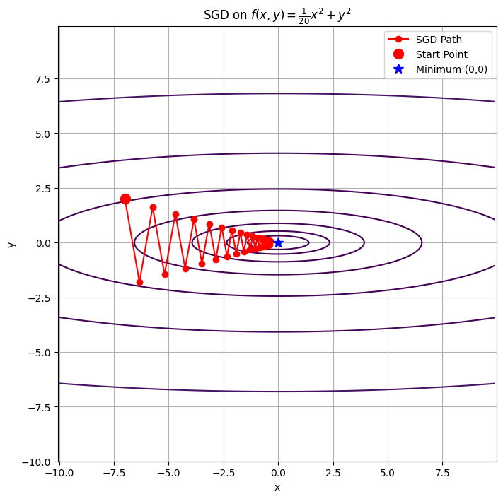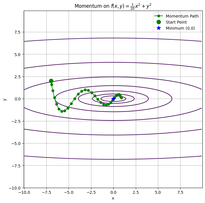 - 시작점(-7, 2)에서 출발한 경로는 y축을 따라 지그재그로 크게 흔들리며 최솟값 (0, 0)으로 천천히 수렴하는 것을 볼 수 있음.