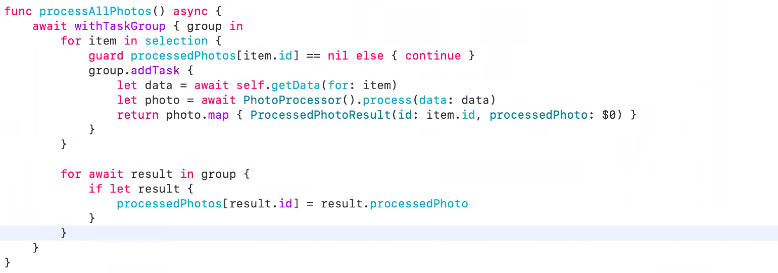 PhotoProcessor에서 process 함수에 @concurrenct라는 새로운 속성을 적용하고, async를 새롭게 적용함.