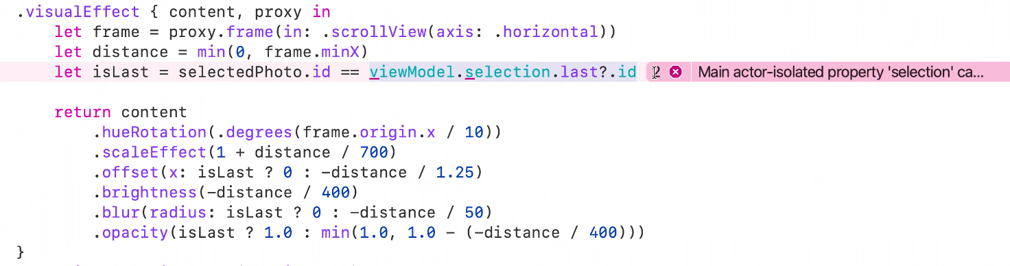 : VisualEffect는 @Sendable 클로저로 나중에 백그라운드에서 실행됨.