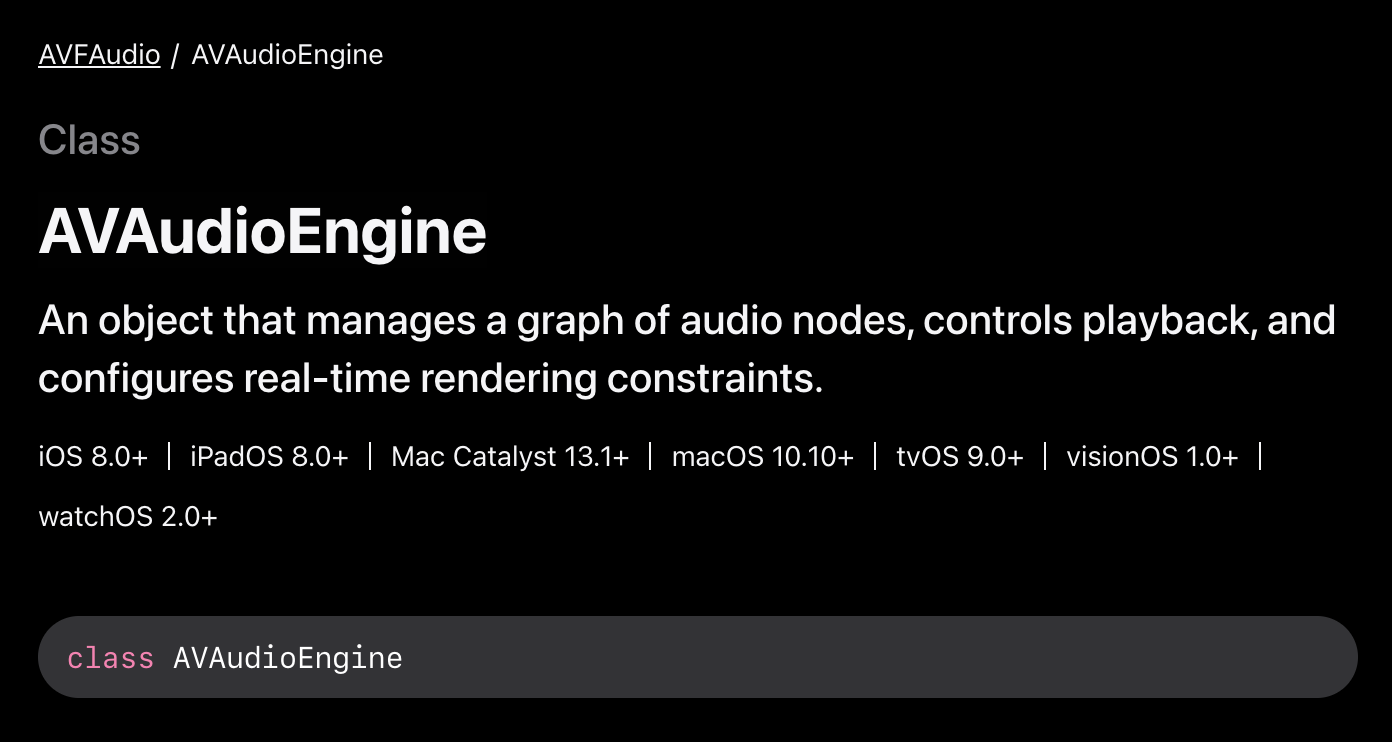 AVAudioEngine, AVAudioNode 정리 AVAudioEngine과 관련한 내용을 모아서 정리 목차AVAudioEngine오디오 렌더링이란?OverviewCreate an Engine for Audio File PlaybackAVAudioNodeOverviewConfiguring an Input Format BusAVAudioNodeBusinputFormat(forBus:)name(forInputBus:)numberOfInputsCreating an Output Format BusoutputFormat(forBus:)name(forOutputBus:)numberOfOutputsInstalling and Removing an Audio TapinstallTap(onBus:bufferSize:..
