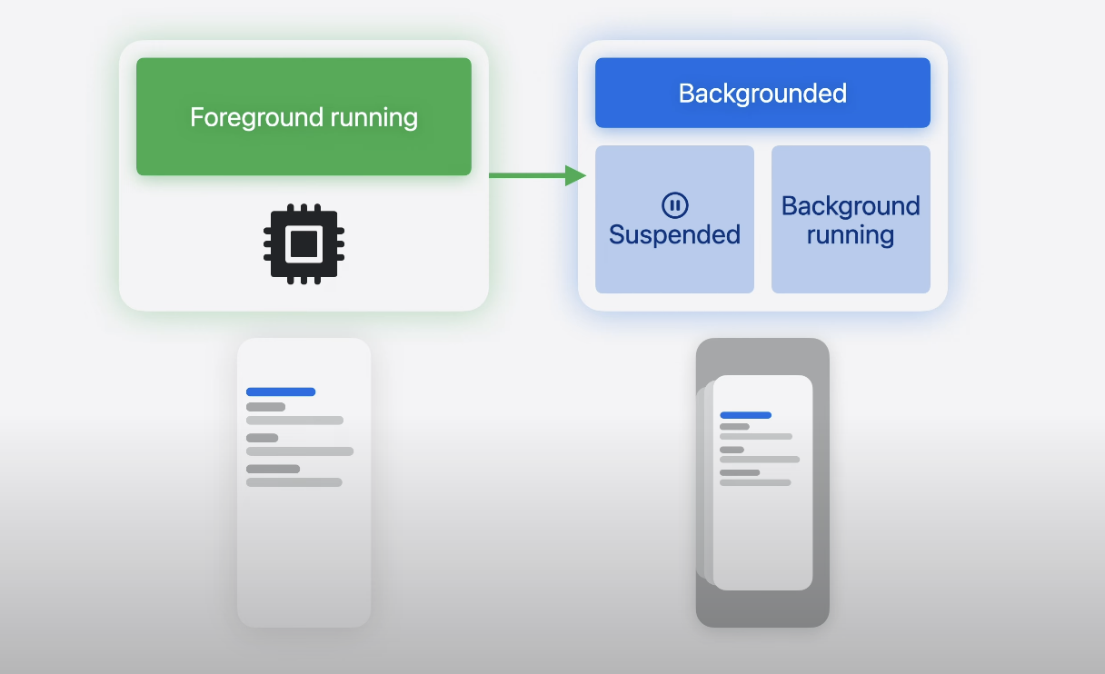 백그라운드에서 작업 완료하기 (Finish tasks in the background) -wwdc25 사용자가 앱을 나가고도 프로세스가 살아 있으면 앱은 백그라운드로 전환.기본적으로 백그라운드 앱은 Suspended 되어서 CPU를 사용하지 않게 됨. 이는 배터리를 보호하고 개인 정보를 지키며 foreground 앱에 더 많은 리소스를 확보해 줌. 경우에 따라서는 앱은 suspened 전 작업을 마무리 할 수 있도록 백그라운드에 실행을 요청할 수 있음. 백그라운드 런타임을 사용하기 전에 시스템이 리소스를 어떻게 우선순위화 하고 관리하는지 그리고 앱 안에서 무엇을 할 수 있을지 이해하는 것이 좋음. 시스템의 목표는 배터리를 보호하고 개인정보를 지키며 반응성 좋은 앱을 만드는 것임.즉, 백그라운드 실행은..